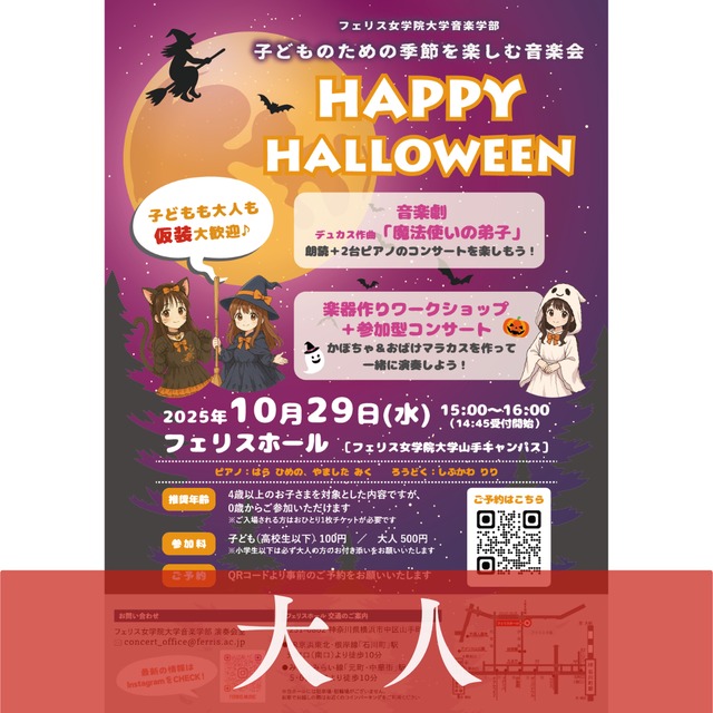 【日時】 2026年2月25日(水)15:00~16:00(14:45受付開始) 【会場】 フェリスホール アクセス:https://maps.app.goo.gl/Pi2S6BohESi8pkAMA 【内容】 ✩⡱ 春をテーマにした音楽 童謡からクラシックの名曲まで♪ ✩⡱ 楽器作りワークショップ+参加型コンサート♪ 手作り太鼓(小鼓)を作ろう! 一緒に叩いて演奏に参加! ※楽器はお子さまお一人あたり、お一つ作成いただきます ----- このイベントは4歳以上のお子さまを対象とした内容ですが、0歳からご参加いただけます。 ご入場される方は必ずおひとり1枚チケットをご予約ください(0歳からチケットが必要です)。 ----- 【出演】 ヴァイオリン/渕澤優希 (音楽芸術学科3年生) 髙松里菜 (音楽芸術学科2年生) ヴィオラ/朝見美嘉 (音楽芸術学科3年生) チェロ/下村怜奈 (音楽芸術学科3年生) コントラバス/石津さくら (音楽芸術学科3年生) フルート/大杉千紘 (音楽芸術学科3年生) 板垣舞奏 (音楽芸術学科3年生) クラリネット/湯山咲良 (音楽芸術学科3年生) ピアノ/山下未稀 (音楽芸術学科3年生) 原姫乃 (音楽芸術学科3年生) 進行役/立花雅 (音楽芸術学科3年生) 【参加料】 子ども(高校生以下):100円 大人:500円 ▼大人チケットのご予約はこちら https://ferrismusic.official.ec/items/132997043 ※小学生以下は必ず大人の方のお付き添いをお願いいたします