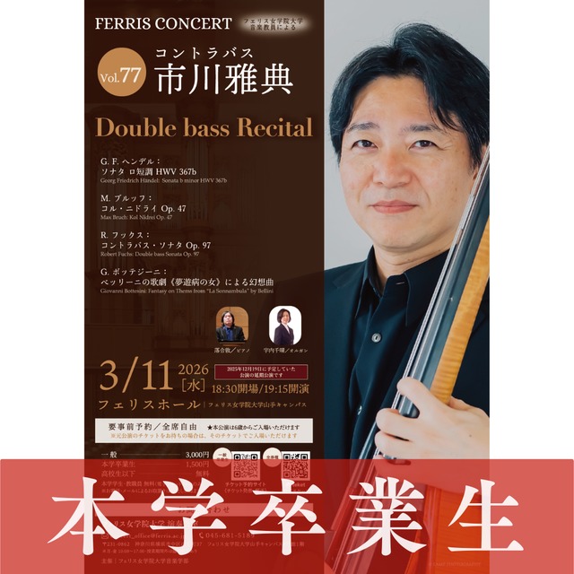 【日時】 2026年3月11日(水)18:30開場/19:15開演 ※この公演は2025年12月19日(金)に開催を予定しておりましたが、2026年3月11日(土)に延期いたしました。 【会場】 フェリスホール アクセス:https://maps.app.goo.gl/Pi2S6BohESi8pkAMA 【出演】 コントラバス/市川雅典 ピアノ/落合敦 オルガン/宇内千晴 【プログラム】 ☆:::::::::::::::☆:::::::::::::::☆ Double bass Recital ☆:::::::::::::::☆:::::::::::::::☆ ♪G. F. ヘンデル:ソナタ ロ短調 HWV 367b ♪M. ブルッフ:コル・ニドライ ♪R. フックス:コントラバス・ソナタ ♪G. ボッテジーニ:ベッリーニの歌劇《夢遊病の女》による幻想曲 【チケット(全席自由)】 一般:3,000円 本学卒業生:1,500円 高校生以下:無料 (申し込み方法は下記参照) 本学学生・教職員:無料 (電子チケットのみ取扱い) ★本公演は6歳以上の方が入場可能です。 ○●○ 高校生以下のチケット申し込み方法 ○●○ 以下のフォームよりお申込みください。 https://forms.gle/vJmjz2XLNGqvSobDA